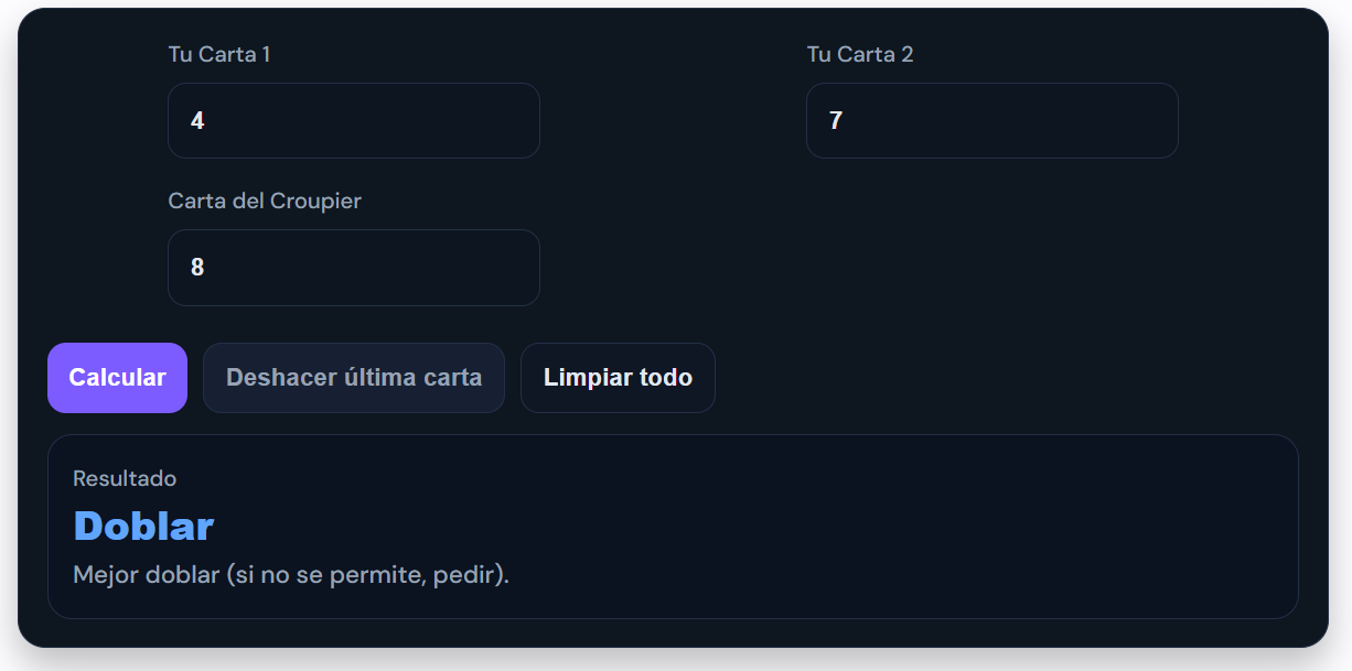 De esa forma, Champion Count te da una recomendación precisa de la mejor jugada en esa mano: pedir, plantarse, doblar o dividir. Esto te permite tomar decisiones con base en la estadística real de la partida, y no en la intuición o en la suerte.