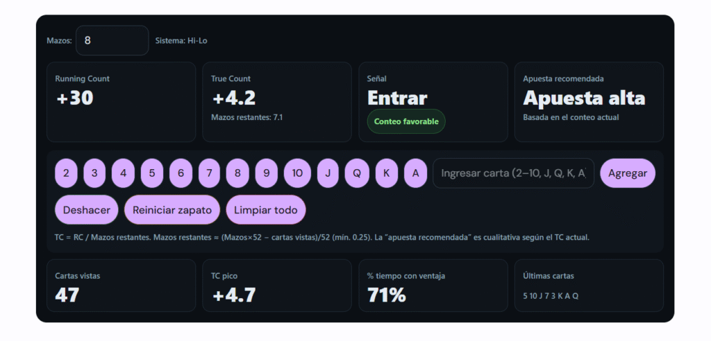 Ese análisis se refleja en el True Count, que es el indicador clave del conteo de cartas. Mientras más alto sea el True Count, mayor será la probabilidad de que aparezcan cartas altas.